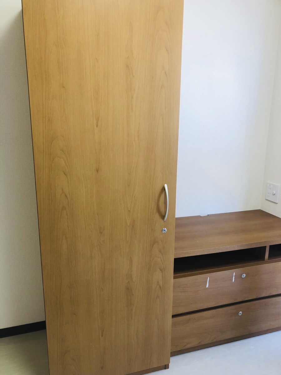 お部屋はエアコン、整理ダンスとテレビ台になる整理棚が備えつけられており